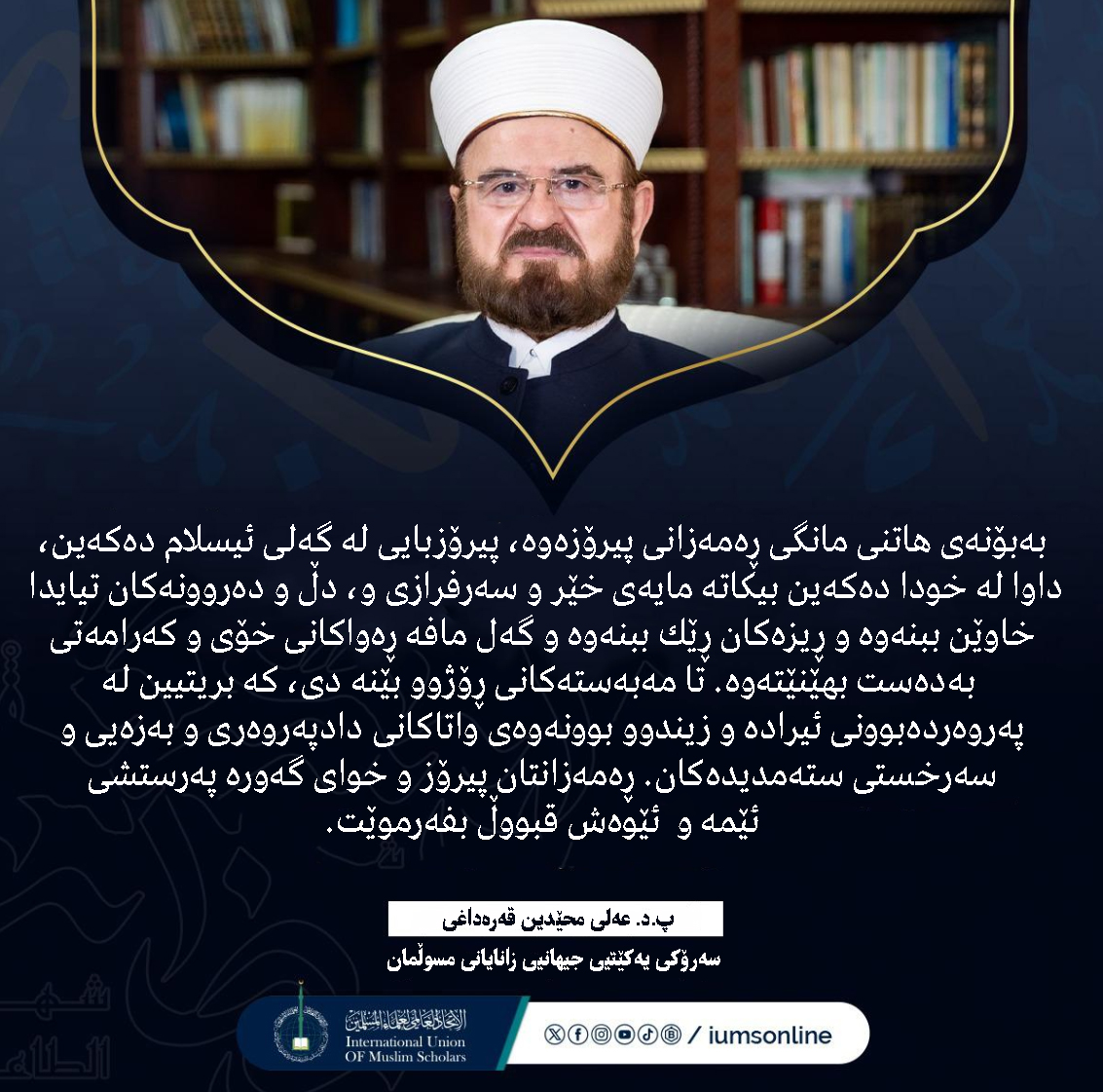 بەبۆنەی هاتنی جەژنی ڕەمەزانی پیرۆزەوە، پ.د. عەلی محێدین قەرەداغی؛ سەرۆكی یەكێتیی جیهانیی زانایانی مسوڵمان، پیرۆزباییەكی گەرم ئاڕاستەی مسوڵمانان دەكات